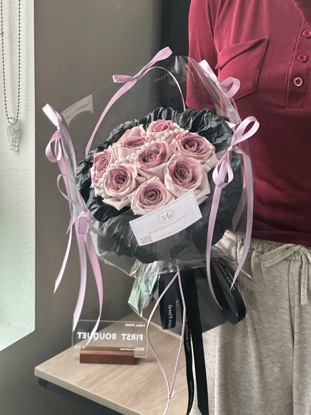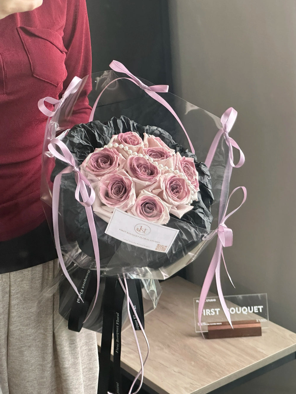 Featuring the unique Manta rose, this bouquet brings together the rich and elegant tones of ume plum-inspired hues—soft mauves, misty purples, and muted blushes. You can choose between the pure Manta rose or a delicately airbrushed version to match your desired aesthetic.