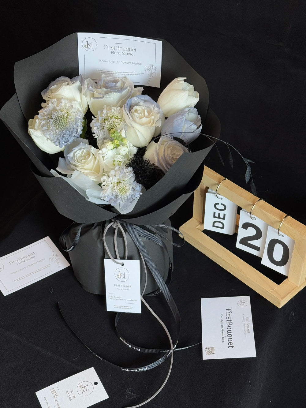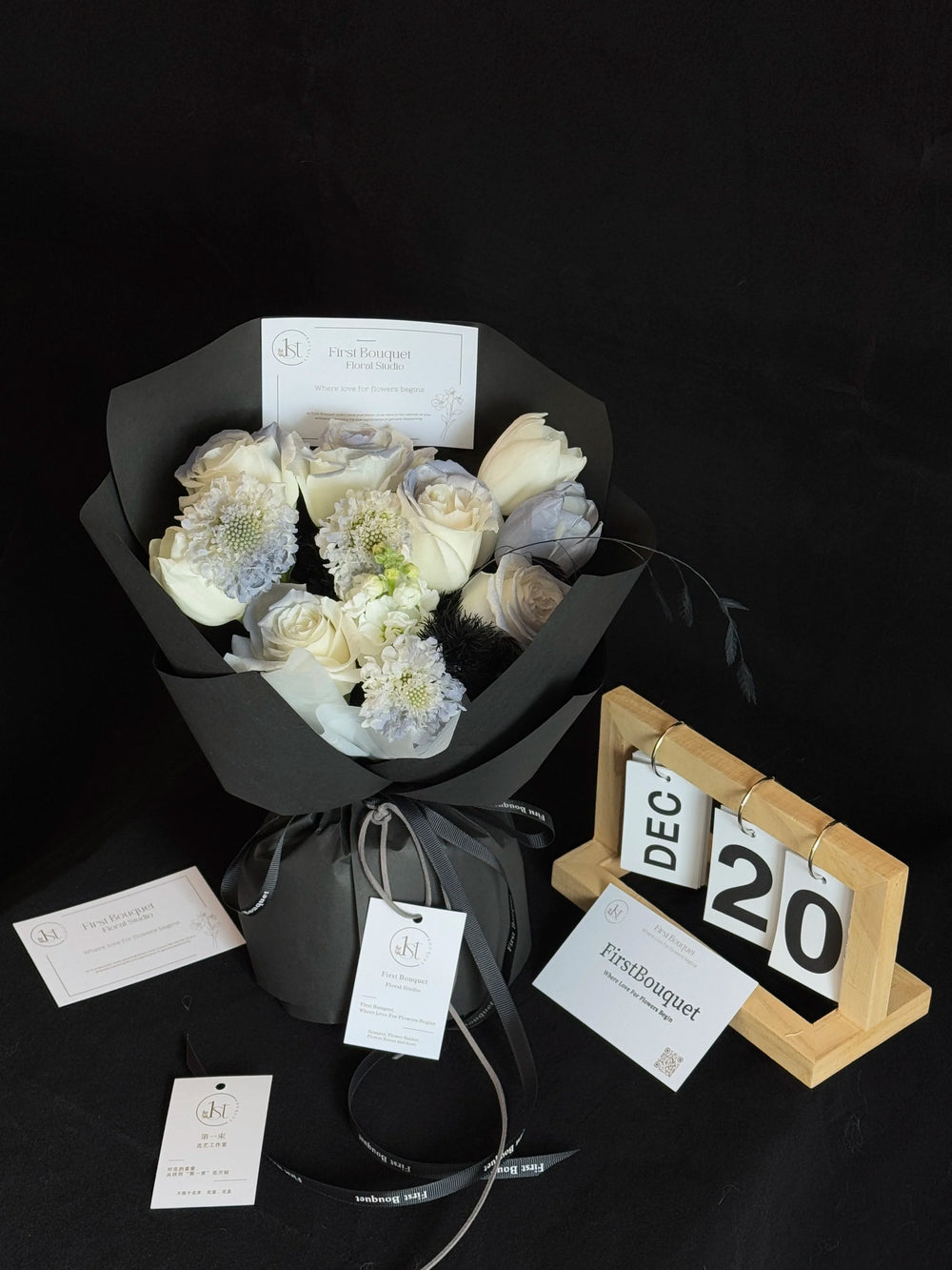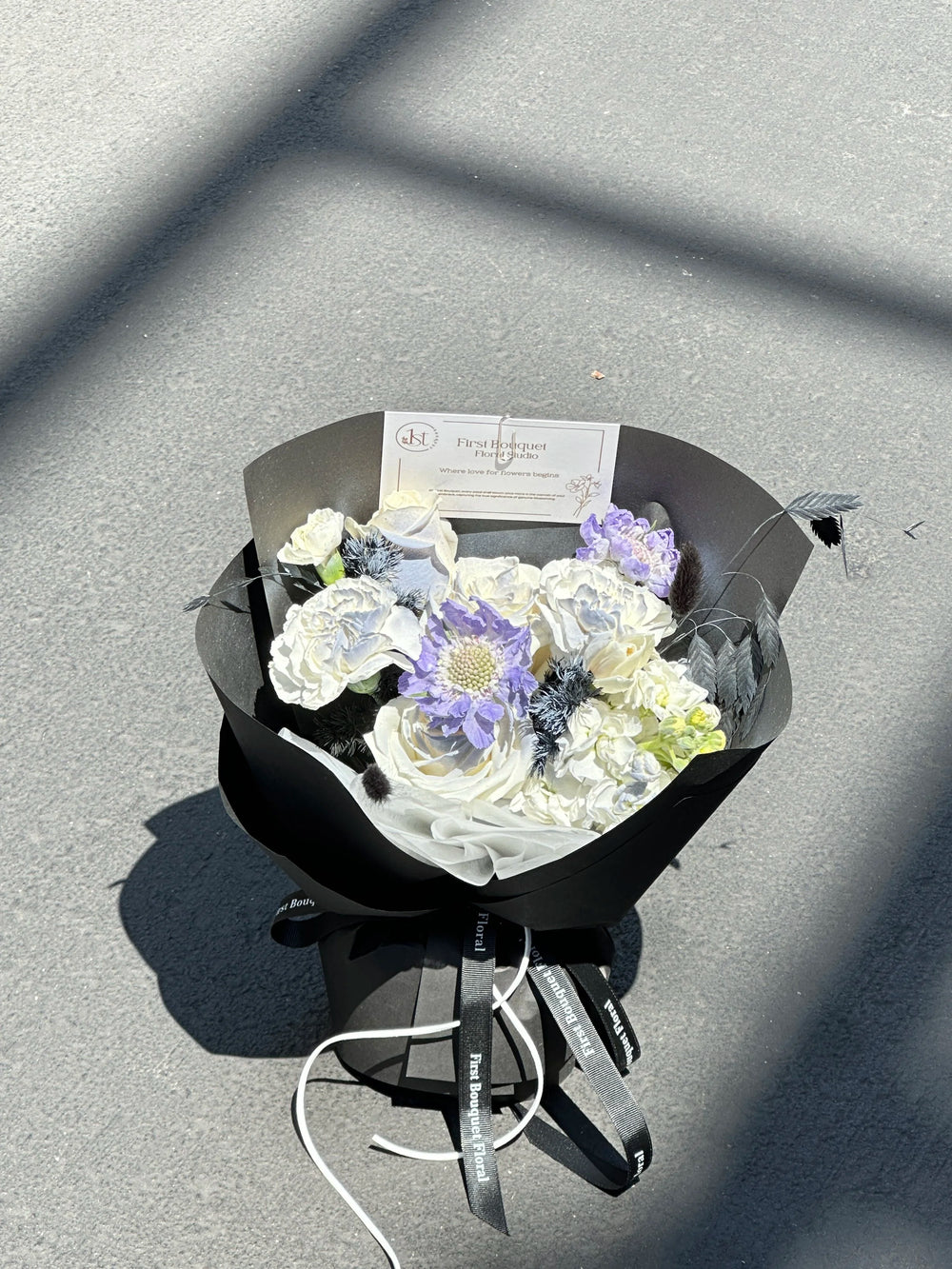 The Misty Gray-Blue Bouquet features crisp white florals, carefully tinted with a professional spray in a sleek gray-blue hue. With its clean lines and balanced size—between small and medium—it’s a subtle yet striking gift, perfect for birthdays, meet-ups, or special moments.