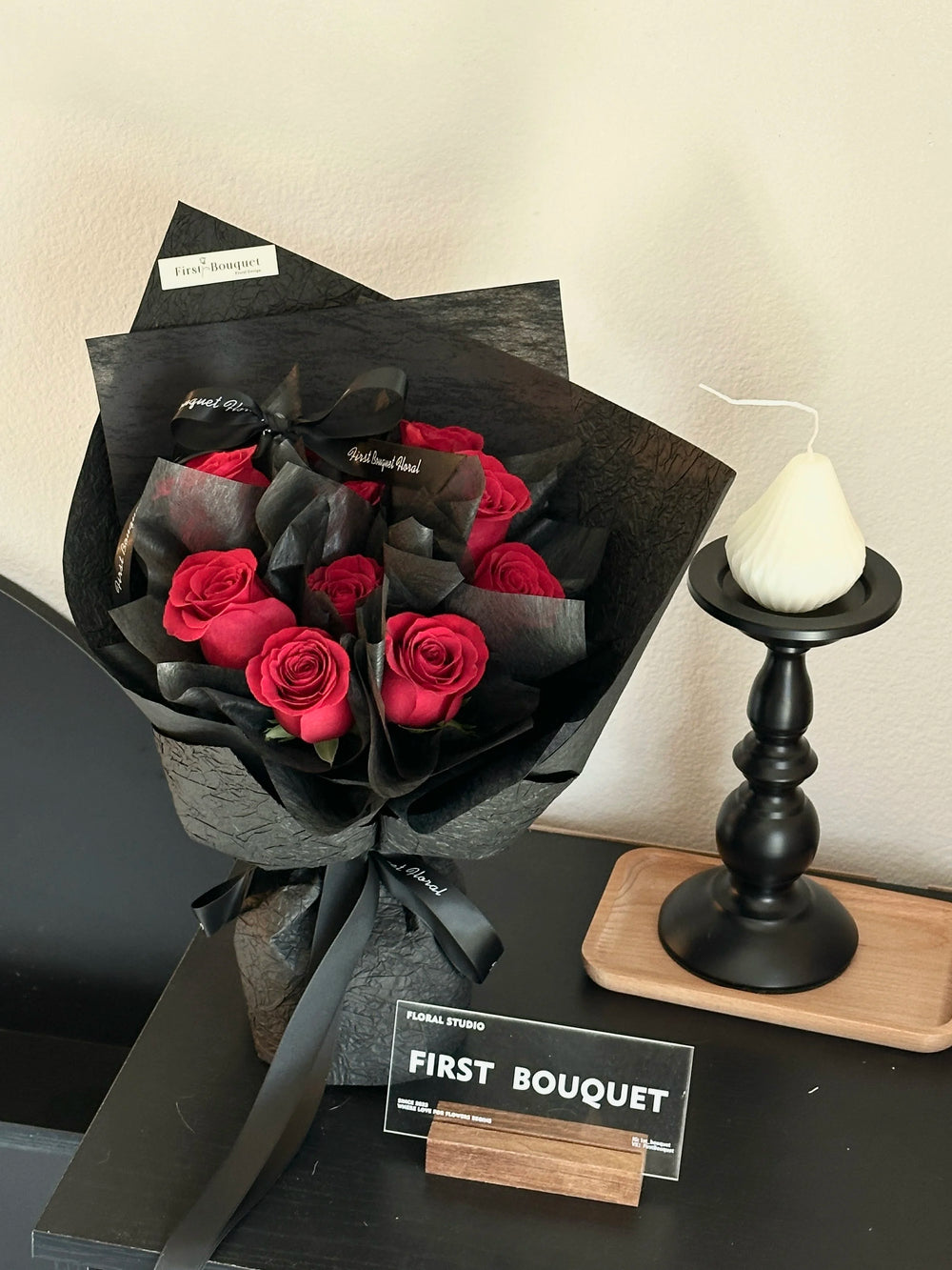 A bouquet wrapped in elegance and depth. Each rose is carefully layered with soft milk-textured liner inside black designer paper, creating a bold yet refined look.