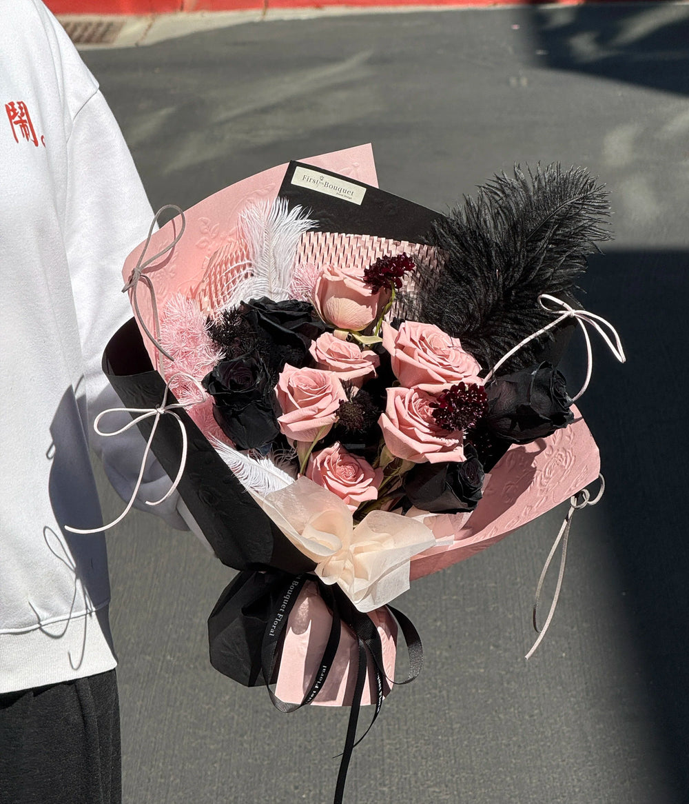 Soft pink roses intertwine with rare Ecuadorian black roses, symbolizing both tenderness and elegance. The bouquet is finished with airy ostrich feathers and lush podocarpus pine, creating a striking contrast of textures.