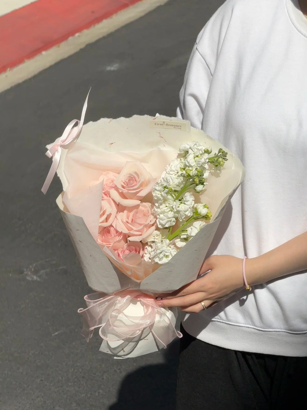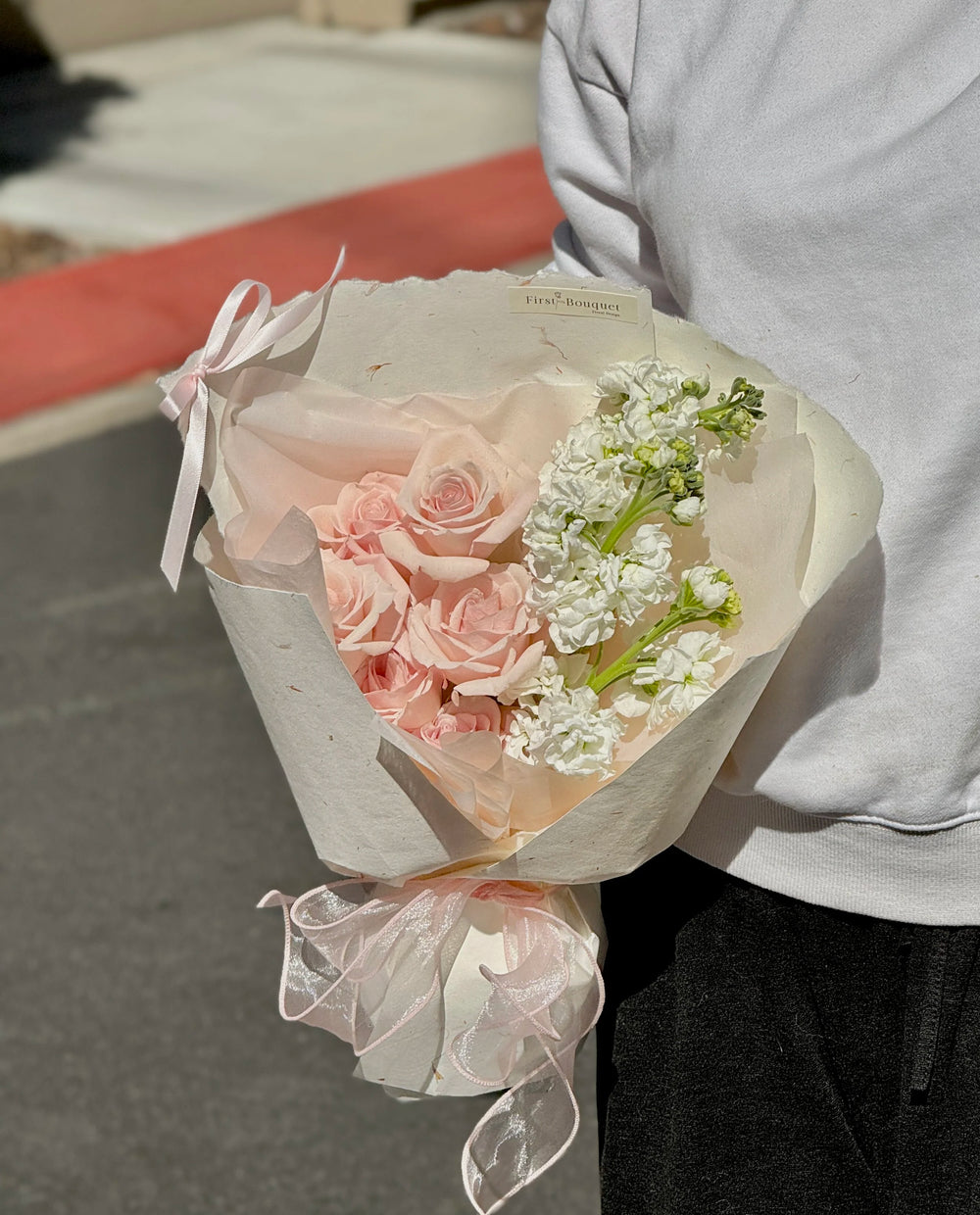 The Sweet & Lovely Bouquet is crafted with delicate pink roses and fresh white stock, symbolizing romance, purity, and joy. Designed with floral foam for longer-lasting freshness, this bouquet is perfect as a thoughtful gift or a charming table arrangement.