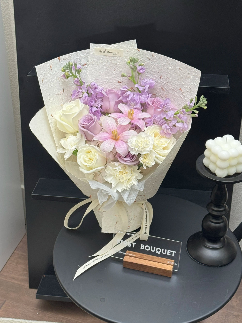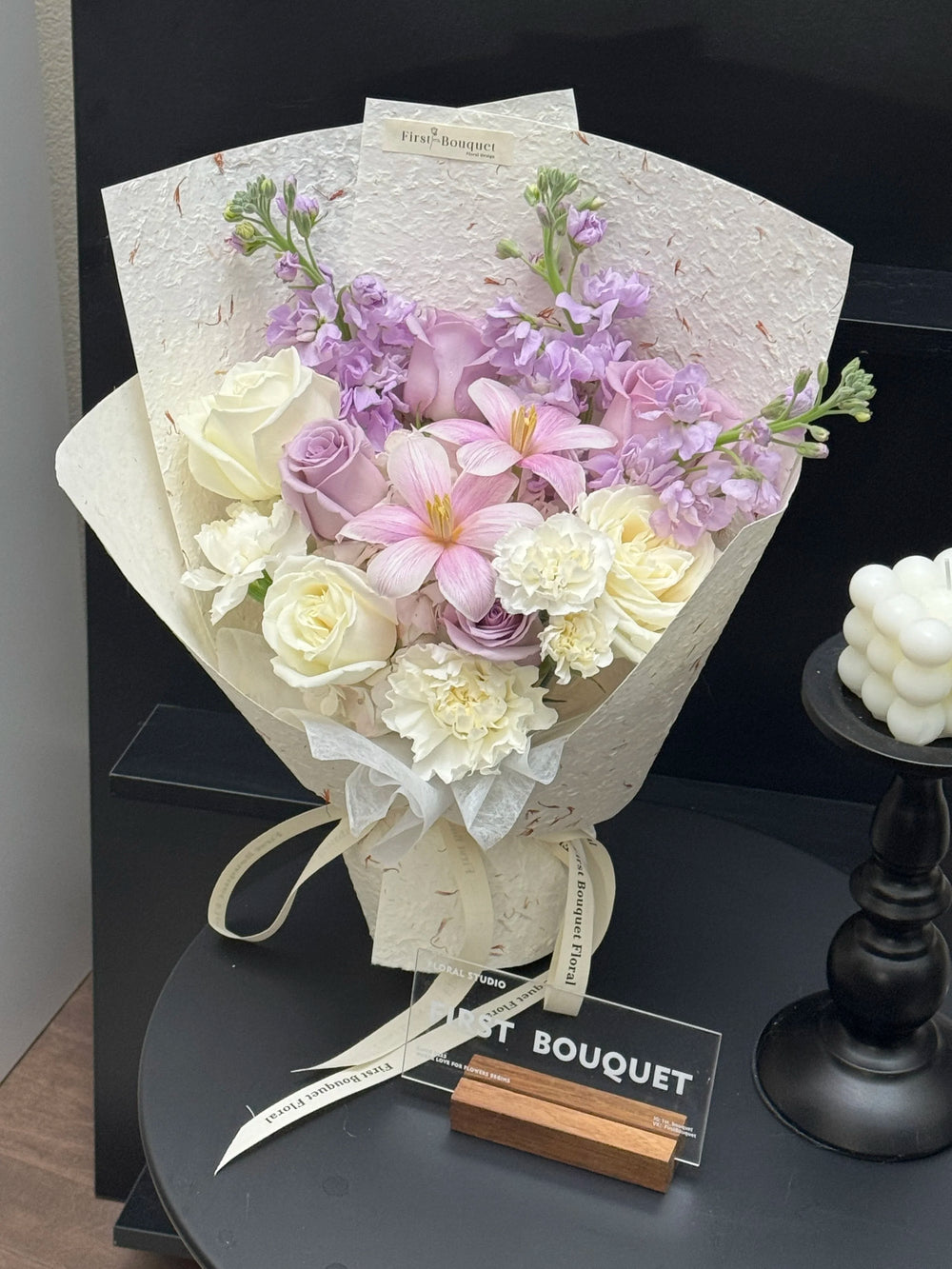 Inspired by the elegance of soft lilac and ivory tones, “Violet Muse” brings together seasonal blooms such as roses and lilies to create a calm, dreamy atmosphere. Wrapped in a textured paper that enhances its natural beauty, each bouquet feels poetic and serene