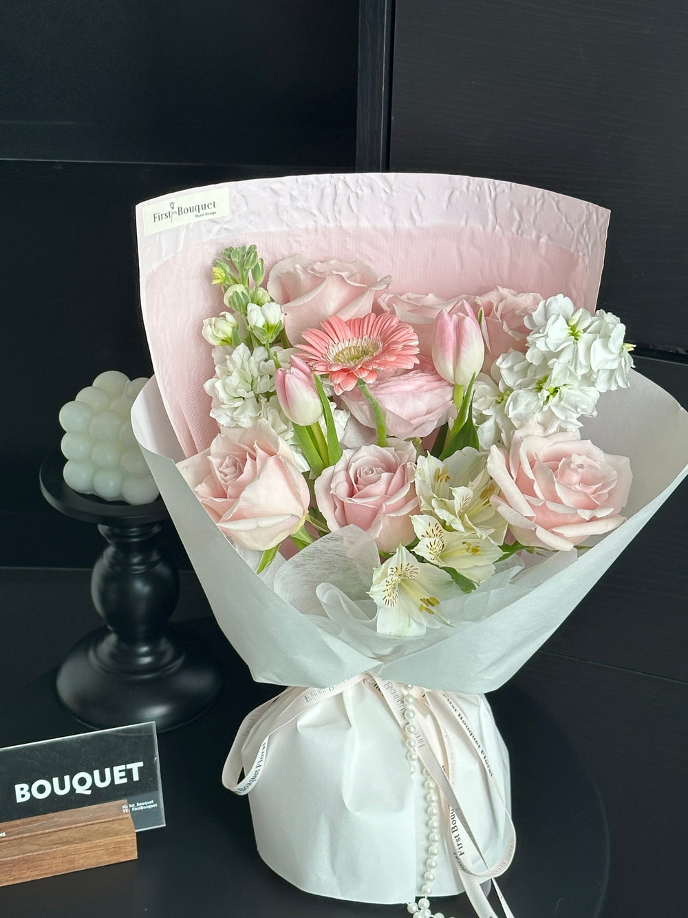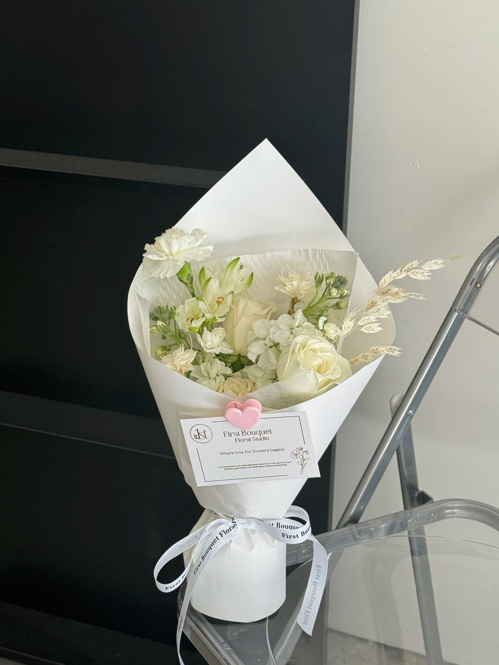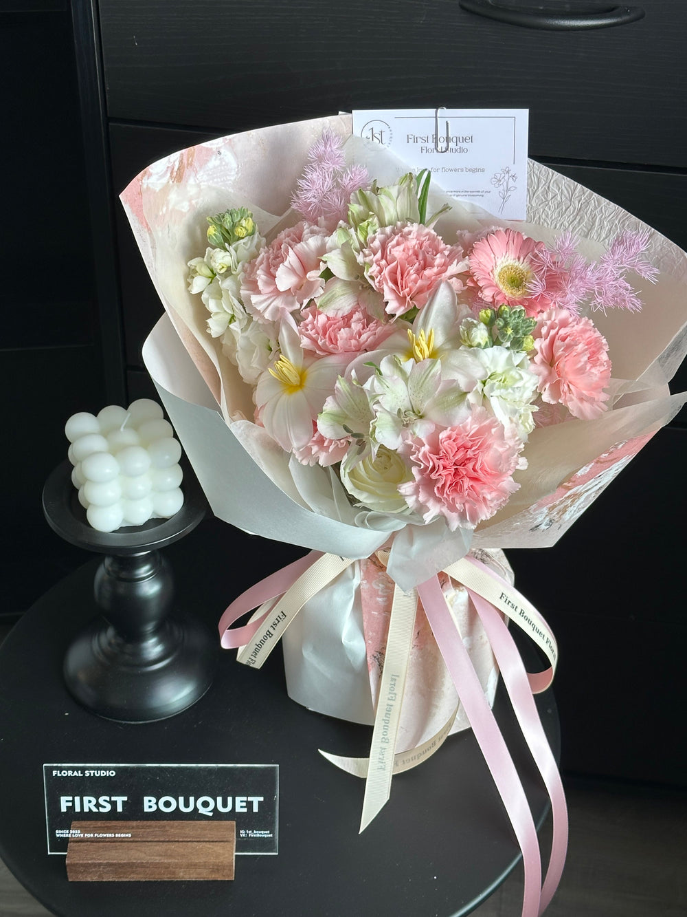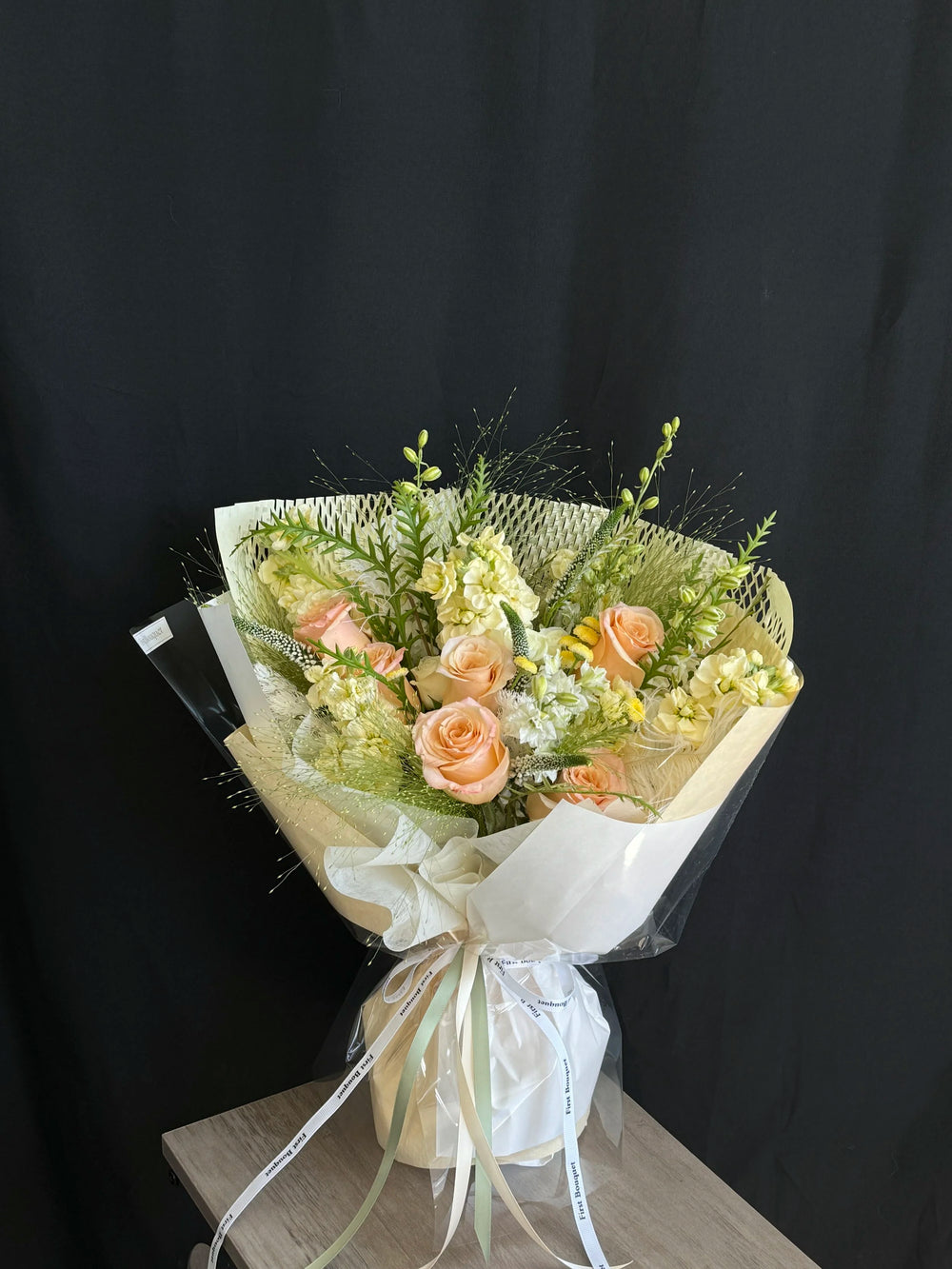插花可能包含染色花、喷绘花、保鲜花、干花元素或羽毛。如果您偏爱全天然的鲜花,我们建议您选择我们的韩式系列。