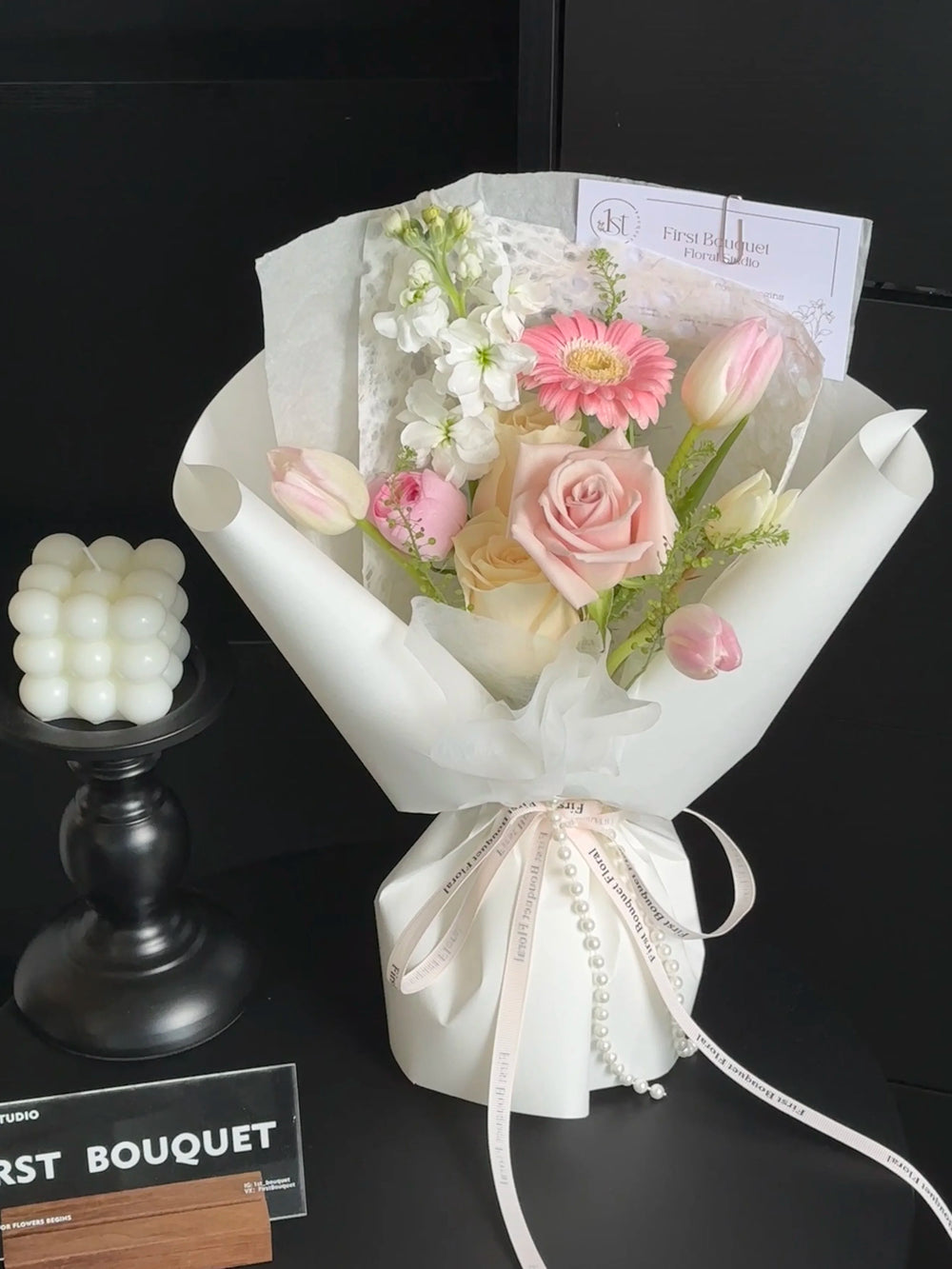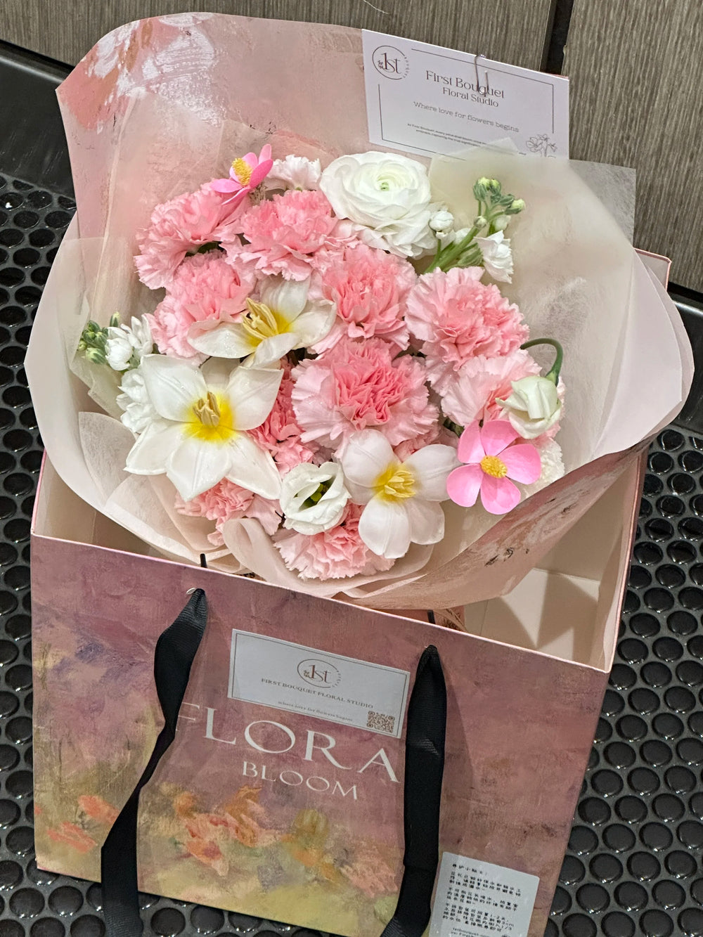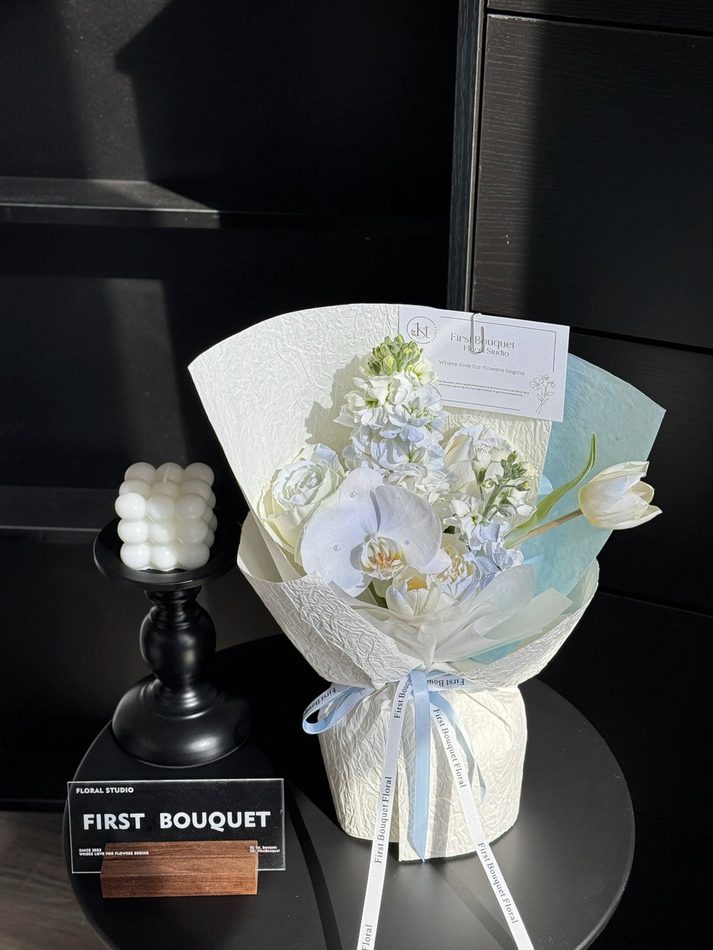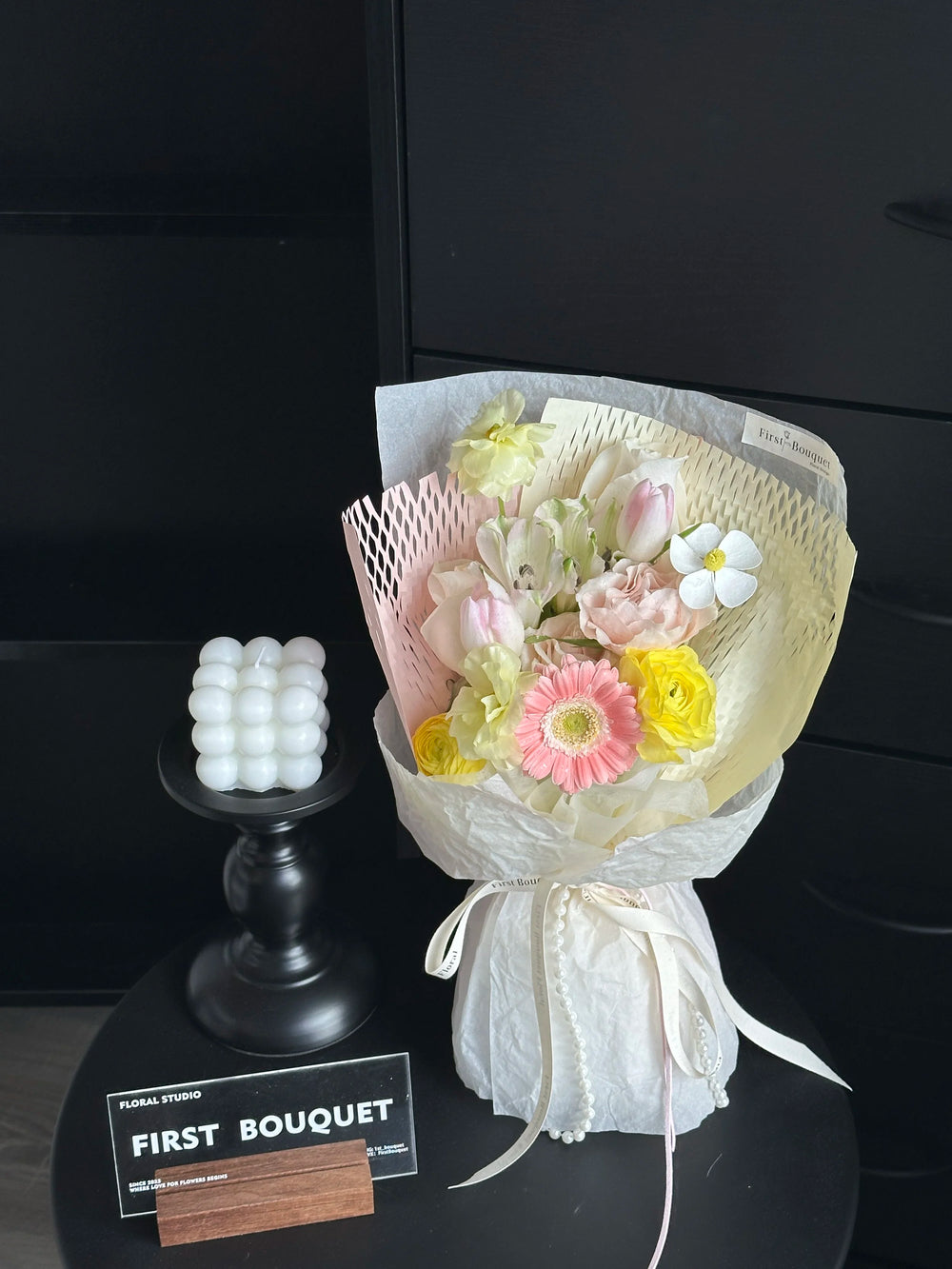 插花可能包含染色花、喷绘花、保鲜花、干花元素或羽毛。如果您偏爱全天然的鲜花,我们建议您选择我们的韩式系列。